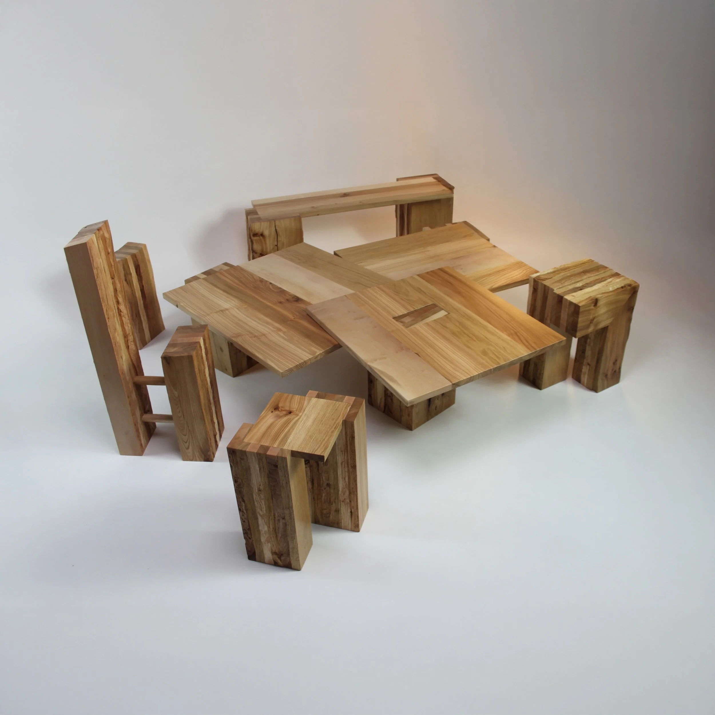 We need to work to promote beauty in diversity. Looking for uniform colour and grain in a living product minimizes what a designer or maker can use, thus substantially increasing the waste involved in converting a tree from it’s original state to a piece of furniture. Increase the noise is a dramatic exemplar of this, contrasting minimalist forms with maximalist visuals and textures.